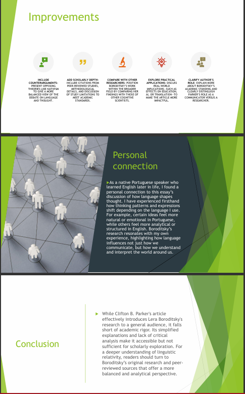 Receiving full credit on my Task 3 draft from my professor reassured me that I was on the right track, but it didn’t mean I stopped improving. The feedback gave me confidence in my direction, especially in how I translated the original research review into a multimodal format. Still, I spent time refining key elements—from tightening the slide organization to improving clarity in how I explained the article’s weaknesses and added suggestions for deeper scholarly engagement. I also strengthened the visual layout and included a clearer statement of my personal connection to the topic. I chose this project because it let me merge analysis with creativity, and it represents how my understanding of writing has expanded beyond traditional essays. This assignment taught me how to adapt arguments for new platforms, helping me see writing as something flexible—shaped by audience, purpose, and medium. It shows what I’ve learned about clarity, structure, and connecting personal experience with academic content.